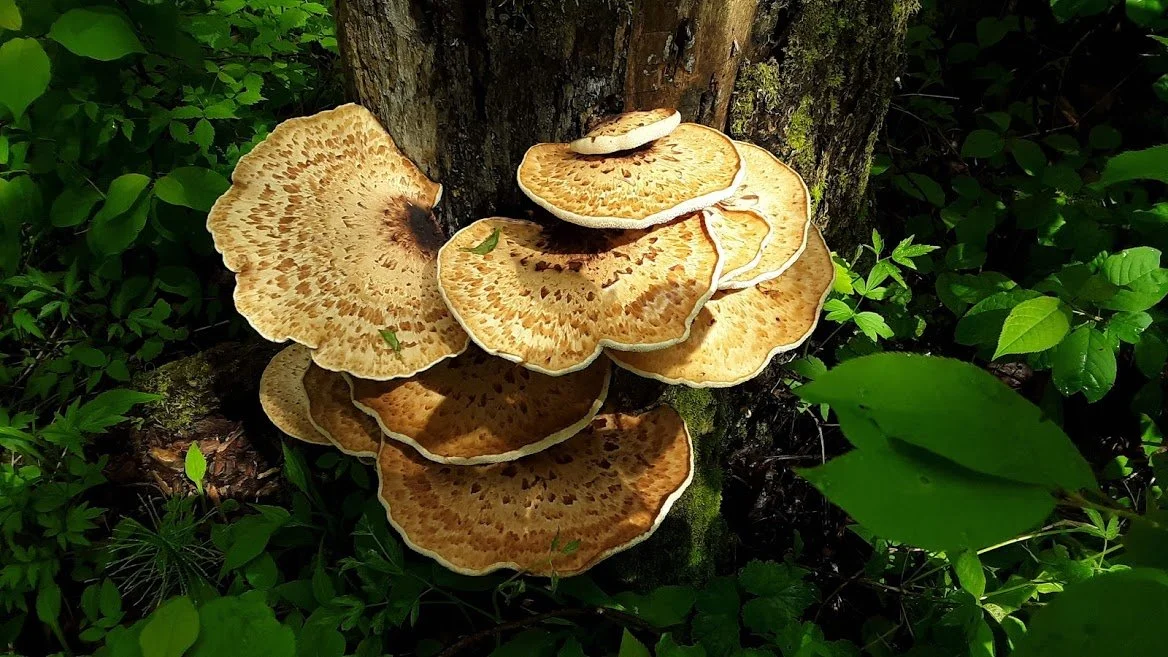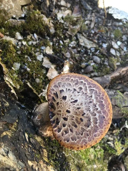 The Pheasent Back shows up in the early spring along side the Morels, some folks will tell you when you see them it marks the end of Morel season, in my opinion that’s not entirely true, I often find them at the same time. Pheasents are a polypore mushroom, meaning no gills, instead tiny pores on the underside (as pictured). They are easy to ID based on their look, which resembles an actual pheasents tail feathers but also their scent, which smells like fresh cucumber or watermelon rinds, it’s actually one of my favorite smelling mushrooms! It is an edible mushroom and is best to cook up when young and tender, as it matures it gets bitter in the pan, I often dehydrate and grind them to be used in salts and seasonings. They really are one of the prettiest designs on a mushroom cap and flavor wise they can be a choice edible if you catch them at the perfect time. Be on the look for Pheasent Backs this month growing on dead or dying hardwoods such as Elm, Maple, Poplar and Ash trees.