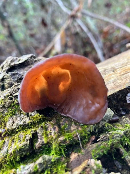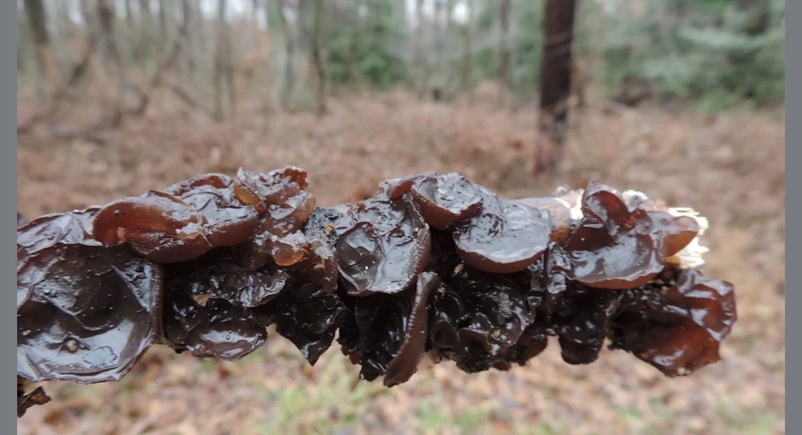 Wood Ear is a gelatinous little mushroom that can grow on living or dying trees, mostly branches, and shows up throughout the year but flourishes in spring. They are amber and somewhat translucent, their shape actually looks like a human ear. These mushrooms are edible and have been popular in Asian cuisine for centuries, notably in stir fry dishes, soups and even salads. Their taste is rather bland but they absorb what ever flavors you cook them in quite nicely. Wood Ears dehydrate well and can be laid out on a counter even for a few days, they also are one of the best to rehydrate. The Amber Jelly Roll (pictured third) looks very much like the Wood Ear however is much more bunched together and has a more cup like look. It is also edible and can be consumed raw or cooked, it is also bland in flavor.